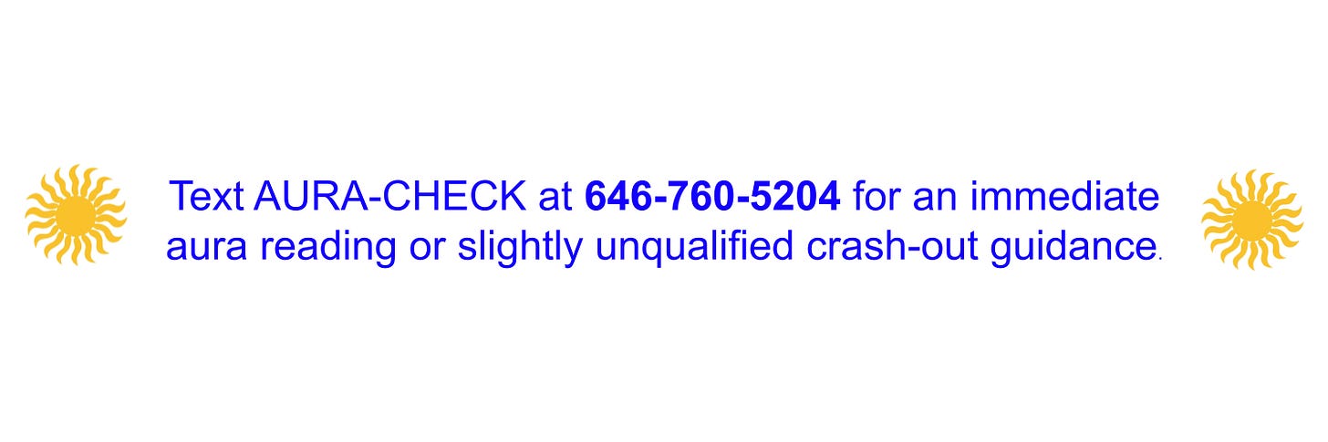 The hotline is an MVP of an MVP. The next iteration will blend your biometrics, daily rhythms—even screen time—and reflect it back with personality. In the meantime, text Aura Check at 646-760-5204 for light emotional tech support (not actual crisis). Please let me know what you think by texting “Feedback” to the same number.