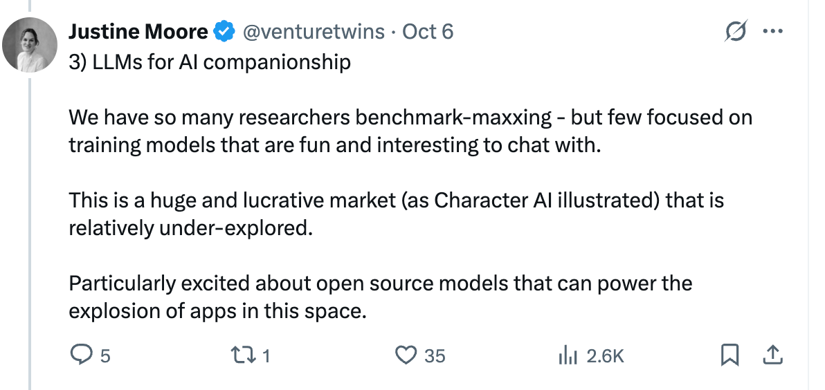 This also sets the stage for what’s next: layering in context like biometrics and emotional state, and riding the infrastructure wave as conversational LLMs get better. As Justine Moore recently wrote in her “call for startups,” there’s still a big gap between benchmark-maxing and models that are actually fun and interesting to talk to.